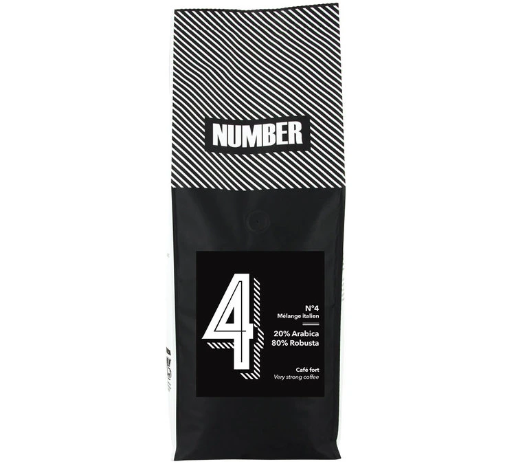Le Number 4 est un 80 % Robusta / 20 % Arabica composé de café en grain d’Inde et d’Honduras.